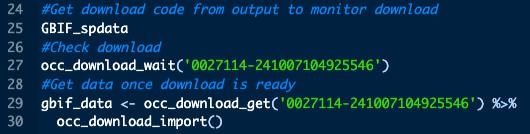 As described in this output, we use the occ_download_wait() command with the associated download key in order to check the download status, and once it has finished we use the occ_download_get() and occ_download_import() commands to import the data as an R dataframe object: