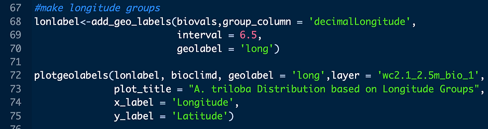 To test our hypothesis that western and eastern genetic groups may be experiencing different environmental conditions, let’s split the sample distribution by longitudinal intervals. Use the add_geo_labels() function to create labels for the GBIF samples, assigning intervals based on the ‘decimalLongitude’ column. We'll make a new dataframe object called 'lonlabel', name the label column as ‘long’, and setlongitudinal intervals of 6.5 degrees for our eastern to western groups. Plot these intervals using the plotgeolabels() function, designating ‘long’ as the geolabel variable we designated and plotting it alongside the BIO1 raster (i.e. layer = 'wc2.1_2.5m_bio1'):
