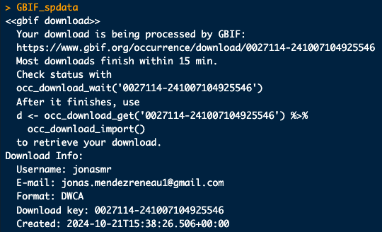 To download data from GBIF, you'll need to have a GBIF account. You can enter your username and password credentials either through the usethis::edit_r_environ() function or directly into the occ_download() function. To download the data for a specific species, first retrieve its “usageKey” or “taxonKey” using the name_backbone() function, inputting the genus and species (in this case, A. triloba). Store the returned taxonKey in an object to be used in the occ_download() function to begin downloading the data from GBIF. Once you have successfully created the GBIF_spdata object, check its contents in order to get the specific download key for the dataset; resulting in the following output: