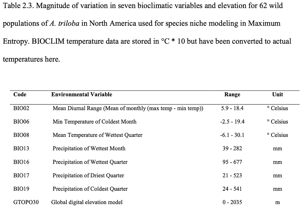In this analysis of A. triloba, we observed trends differentiating western and eastern populations, roughly aligning with the major genetic groups identified in Dr. Wyatt’s research. Specifically, western populations tended to experience colder and drier conditions during key periods of the year, while eastern populations were exposed to more consistent moisture and milder temperatures. This suggests that the environmental differences between these regions may contribute to the genetic divergence observed across the species’ range.