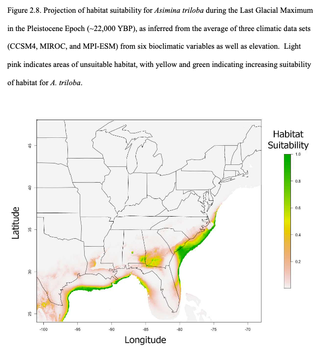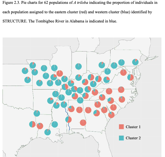 In this article and tutorial, we will explore how the climate variation within the pawpaw's range is related to its population structure, using GBIF collection data and the GBIF-Bioclim R toolkit. Specifically, we’ll investigate how climatic factors correlate with the genetic differentiation observed across its range, drawing on insights from Graham Edward Wyatt’s 2019 dissertation [1]. Wyatt’s research identified two major genetic groups in A. triloba populations, largely split by the Appalachian Mountains and the Tombigbee river in Alabama. These groups are hypothesized to have originated from separate refugia during the last glacial maximum, one along the East Coast and the other along the Gulf Coast.