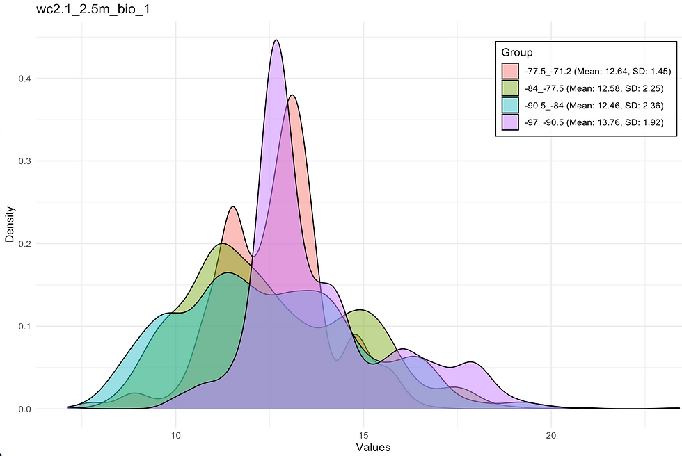 Initial results indicate that the distribution of annual mean temperature is largely overlapping across the different longitudinal groups, with the Mideastern group showing a slight binomial distribution, as predicted. Overall, the groups appear to form a single normal distribution. To refine our analysis, we will focus on bioclimatic variables identified by Dr. Wyatt’s research, which were found to be informative in modeling A. triloba's distribution. Specifically, we will assess temperature variation using BIO8 (Mean Temperature of the Wettest Quarter) and precipitation patterns using BIO13 (Precipitation of the Wettest Month), BIO17 (Precipitation of the Driest Quarter), and BIO19 (Precipitation of the Coldest Quarter). We will use the plot_bioclim2() function again, following the same procedure as before but adjusting the value_column to match the variables of interest by changing the 'wc2.1_2.5m_bio1' string to the appropriate bioclimatic variable (i.e. 'wc2.1_2.5m_bio19 for BIO19, 'wc2.1_2.5m_bio8' for BIO8, etc...).