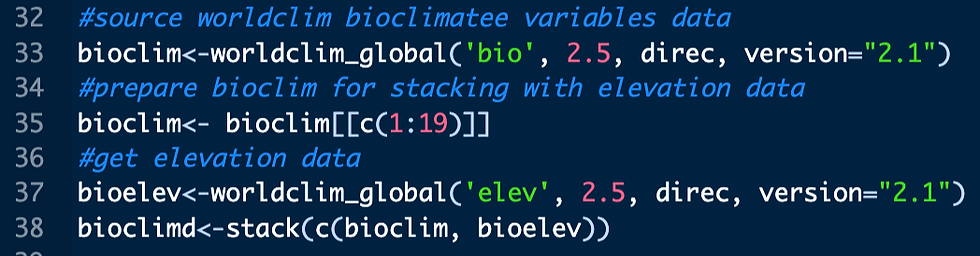 To obtain bioclimatic and elevation data from WorldClim, use the worldclim_global() function from the geodata R package. After retrieving the raster data, use the stack() function to combine the bioclimatic variables and elevation rasters into a raster stack object we are calling 'bioclimd'.