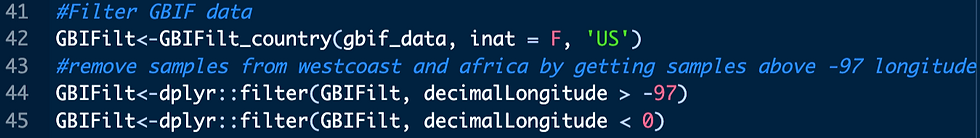 Now that you've sourced both the WorldClim rasters and the collection data from GBIF, the next step is to filter the data. Since we're focusing on A. triloba’s native range, we want to analyze naturally occurring individuals across its distribution. First, use the provided GBIFilt_country() function to limit the data to the United States and remove any samples derived from iNaturalist (This is done to avoid misidentified or cultivated observations as well as reduce sample-size as there are more than enough curated herbarium vouchers we can use for this species). Then, filter out any collections with decimal longitudes west of -97 or east of 0, removing samples from the west coast US and Africa that lacked proper country code data.