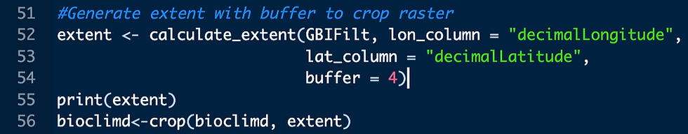 After filtering, the dataset is reduced from 30,596 raw accessions to a more manageable 4,701 samples for analysis. With this final set of samples, calculate an appropriate extent for the raster stack by using the provided calculate_extent() function, applying a 4-degree buffer around the sampling points, and using the output extent to crop the raster stack object we named 'bioclimd'.